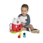 O brinquedo possui o rostinho de um lindo cãozinho, em sua barriguinha ele possui desenhos geométricos para o encaixe das peças. Na parte de trás ele possui um encaixe para que os pequenos possam retirar as peças para começar a brincadeira novamente.